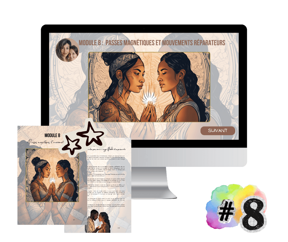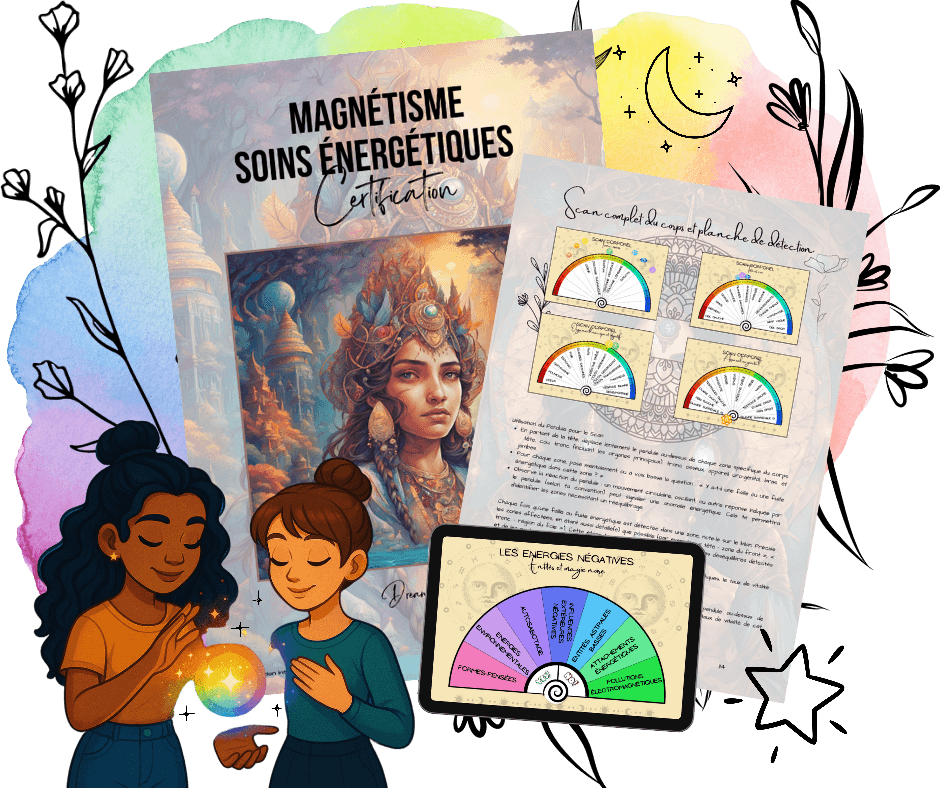 💡 Elle t’enseigne des techniques que peu de praticiens maîtrisent vraiment : harmonisation profonde des chakras, passes magnétiques ciblées, bilans énergétiques complets, nettoyage des lieux, protocoles de protection et soins à distance.