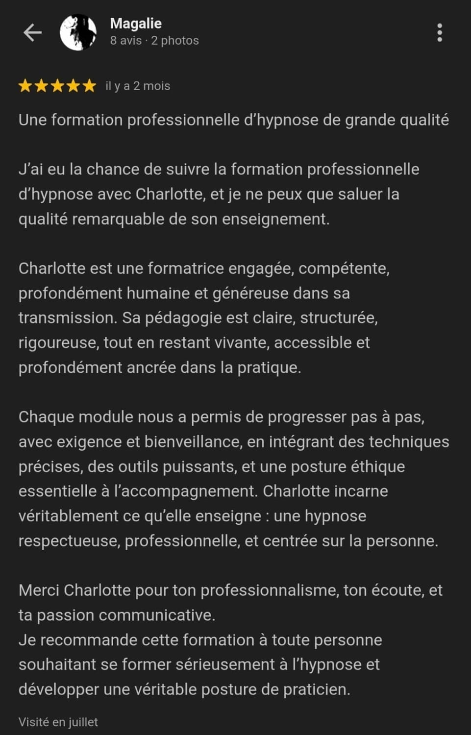 Charlotte enseigne l'hypnose moderne et spirituelle. Forte de 8 ans d'expérience en tant que praticienne en hypnose ericksonienne, je suis passionnée par l'accompagnement.