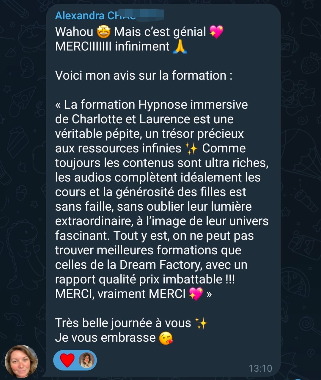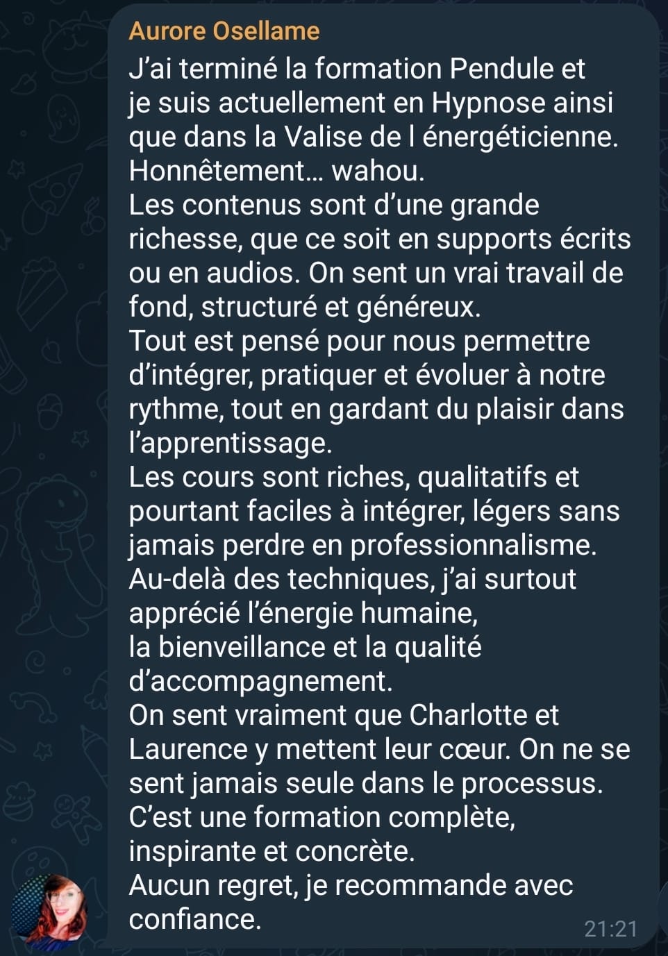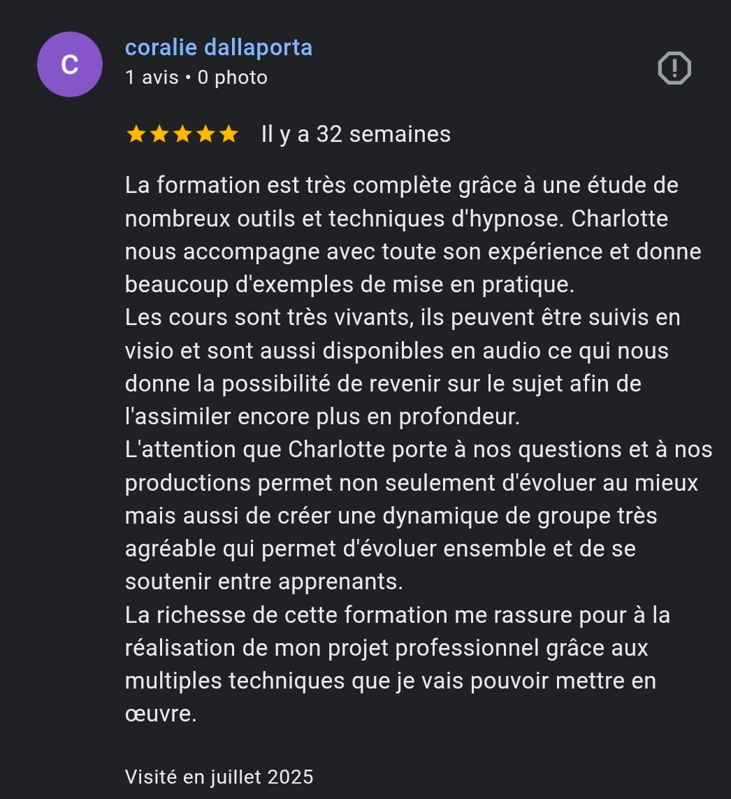 Elle intègre les grands courants de l’hypnose : ericksonienne, elmanienne, classique et humaniste.